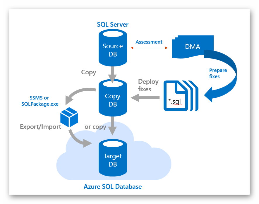 Da die Migration im ersten Fall wie eine Migration von einem SQL-Server zu einem anderen SQL-Server zu sehen ist, kann dies auch mit den gleichen Techniken durchgeführt werden (Stichworte siehe oben). Interessanter wird’s bei der Migration in eine Azure SQL-Datenbank, also die Nutzung als Dienst bzw. Service in der Cloud (PaaS bzw. DBaaS).
