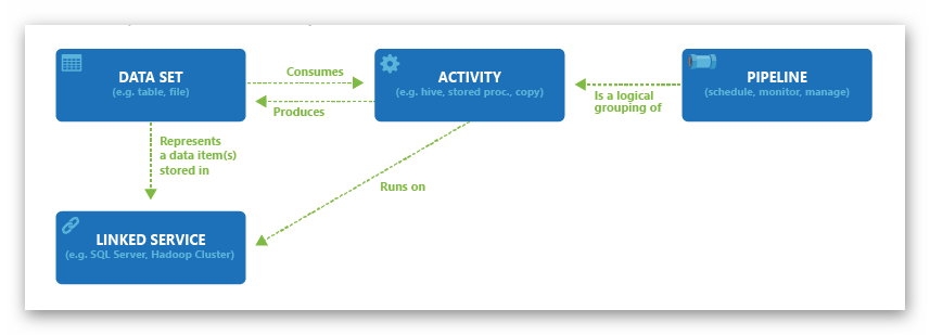 Mit der ADF lassen sich datengetriebene Workflows, hier Pipelines genannt, mit Aktivitäten, hier Activities (data movement und data transformation activities) verknüpfen und verwalten. Datenquellen und Senken können hierbei die Azure Datenquellen aber auch viele On-Premise Datenquellen in Form von Datenbanken, NoSQL, File basierten und generischen http oder ODBC Datasets sein, um nur einen Teil zu nennen.
