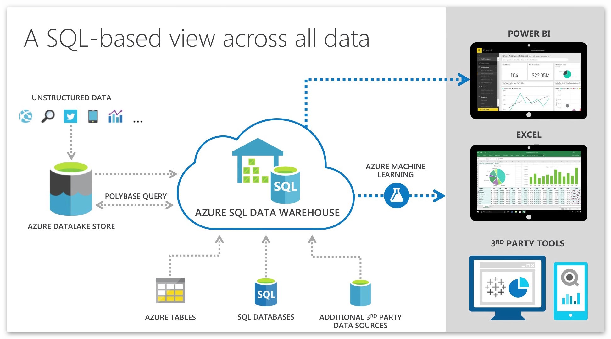 Interessant wird der Data Warehouse-Dienst über die Integration in die Azure-Plattform und Kompatibilität mit den SQL Server Tools. Dies ermöglicht ein sehr leistungsfähiges Zusammenspiel der Azure-Dienste wie Azure Data Factory, Stream Analytics, Machine Learning oder PowerBI. Und dies mit den Werkzeugen und Diensten wie Analysis Service, Integration Service, Reporting Service und insbesondere PolyBase und dem Azure Data Lake Store zur Integration von hybriden Datenquellen (NoSQL, Blob- und Hadoop-Speicher, Filestores etc.).